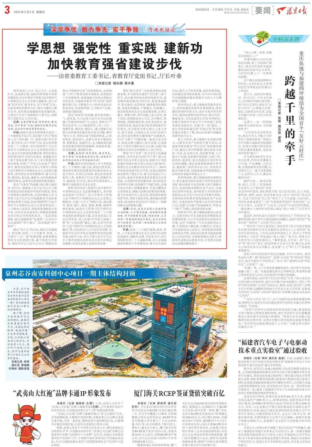 5月5日,福建日报刊发对省委教育工委书记,省教育厅党组书记、厅长叶燊的专访《学思想 强党性 重实践 建新功 加快教育强省建设步伐》。全文如下: