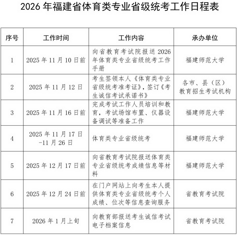 日前,省教育厅印发《关于做好2026年普通高校招生体育类专业省级统一考试工作的通知》,明确2026年福建省普通高校招生体育类专业省级统一考试(以下简称体育类专业省级统考)将于2025年11月17日-11月26日进行。