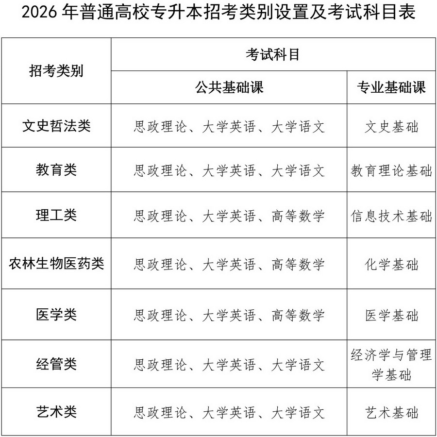 2026年我省普通高校专升本考试招生共设置文史哲法类、教育类、理工类、农林生物医药类、医学类、经管类、艺术类等7个报考类别,考生只能报考1个类别。