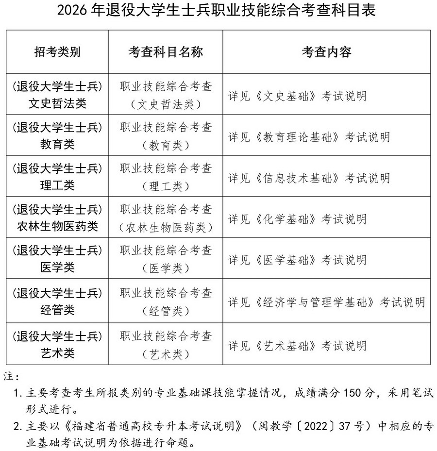 2.退役大学生士兵考生(含选择本类型的获奖考生)免于参加文化课考试,须参加由招生院校根据专业人才培养要求联合命题的职业技能综合考查,考查考生所报类别的专业基础课技能掌握情况,成绩满分150分,采用笔试形式进行,考查时间为2026年3月29日14:30-16:30。