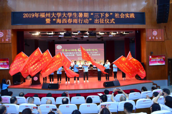 7月2日下午,以“青春心向党 建功新时代”为主题的2019年福州大学大学生暑期“三下乡”社会实践活动暨“海西春雨行动”出征仪式在图书馆博学厅举行。福州大学党委副书记林生,相关部处、各学院党委负责人及师生代表300余人参加出征仪式,与会领导为社会实践重点队、校统一战线成员代表授旗。