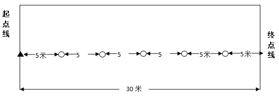 (1)测试场地长20米、宽7米,起点线前5米设置两列标志杆,标志杆距同侧边线3米;各排标志杆相距3米,共5排杆,全长20米,并列的两杆间隔1米(图1)。