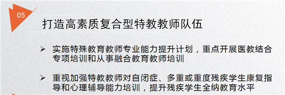 •实施特殊教育教师专业能力提升计划,重点开展医教结合专项培训和从事融合教育教师培训,打造复合型特教专业教师队伍。