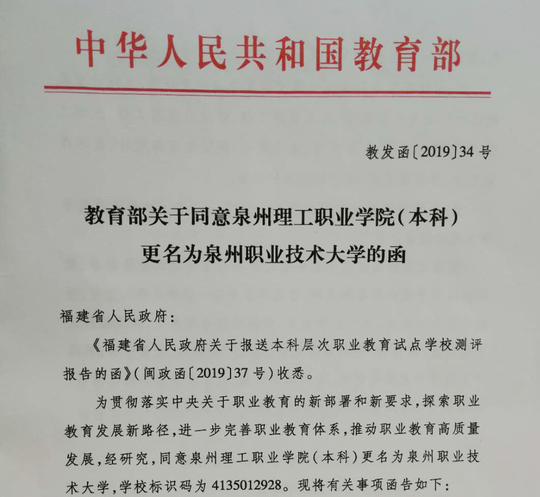 5月27日,教育部同意泉州理工职业学院(本科)更名为泉州职业技术大学,开展本科层次职业教育试点。