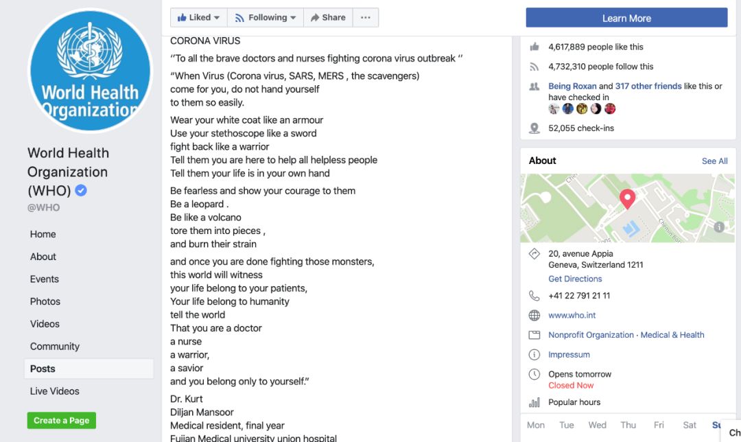科特诗作发布后为世界卫生组织(WHO)所转发