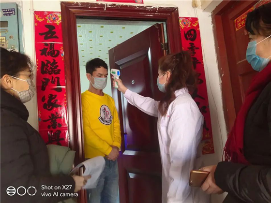返回新疆咯什市的穆妮热·艾尼瓦尔同学在社区为居民测体温