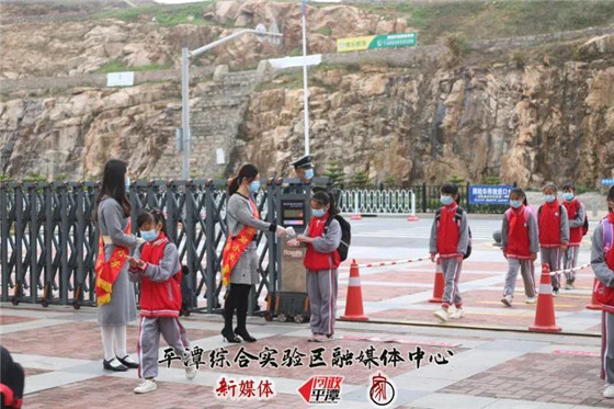 平潭岚城中心小学学生手举“我们开学啦”卡片