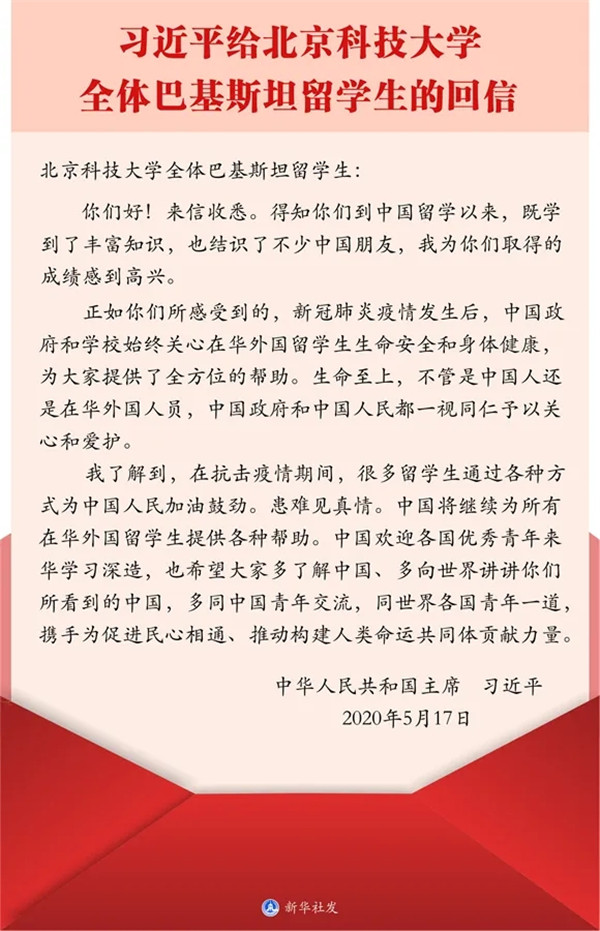 习近平给北京科技大学全体巴基斯坦留学生的回信