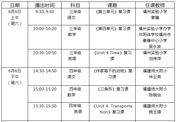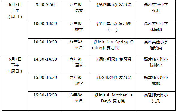 进入6月,不知不觉福建省小学“空中课堂”复习课已经陪伴同学们一个月了,第四周的复习课都有哪些老师授课?复习的又是哪些知识点?一起来看课程表!↓↓↓