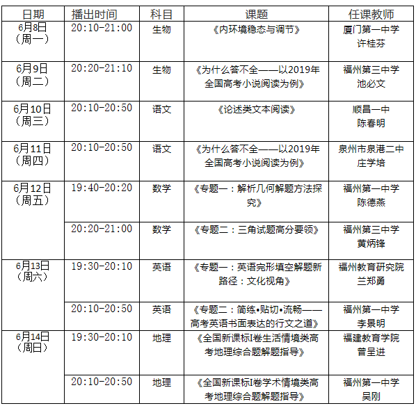 第二张课程表是为高三学子们准备的——由省教育厅、福建教育学院指导,福建教育电视台录制的《空中课堂·备战高考》节目重播课程表。本周五开始,重播课程从一天一节课又恢复为一天两节课,考生们不要错过了!↓↓↓