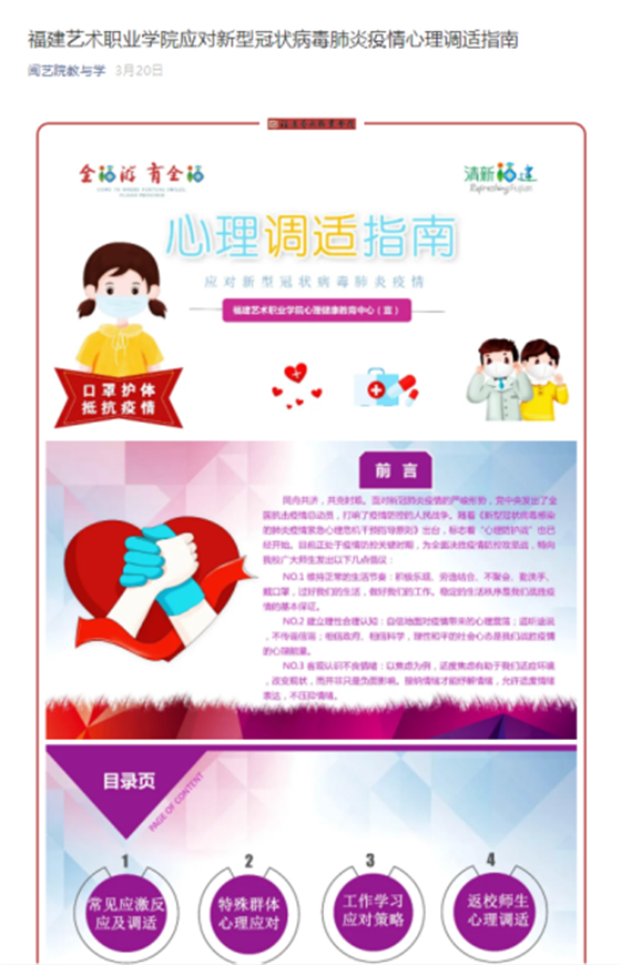 体育科学学院党委积极落实“停课不停学”的要求,在线上开展“我为抗疫做贡献”等主题党日活动,支部党员在线积极交流了运动战役、志愿服务、课程开设与教学等方面的行动、经验、构想。心理学院党委组织教师党员积极利用专业知识服务社会,编撰了《抗新型冠状病毒肺炎心理自助手册(学生版)》和《抗新型冠状病毒肺炎心理自助手册(市民版)》,向学生和市民普及心理自助知识。在中小学全面复课期间,推出《抗疫复学后教师助学心理指南(中小学版)》,为老师在复学后帮助学生“安心、养心、健心”提出建议,促进学生在战胜疫情中实现心理成长。同时,开通了心理支持热线,为福建省乃至全国提供疫情期间的心理危机干预和支持服务。音乐学院行政党支部积极谋划师生返校后的学习工作生活环境保障,组织党员对琴房、音乐厅等教学办公场所开展检查和整治工作。