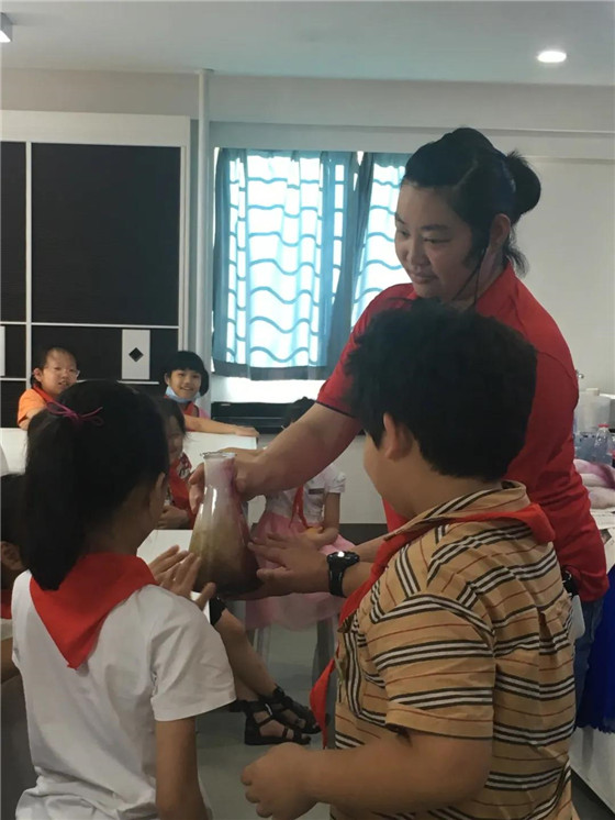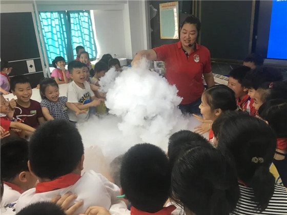 活动中,泉州市科技馆志愿者带来的科学实验表演备受欢迎:用竹签可以不把气球扎爆;用紫甘蓝汁和普通的白醋、雪碧等液体混合,就可以发生变色反应;充足气的气球在温度极低的液氮里面会缩成团并结冰;还有“掌中火”、“大象牙膏”……神奇的科学实验引起学生们一阵又一阵的惊叹。