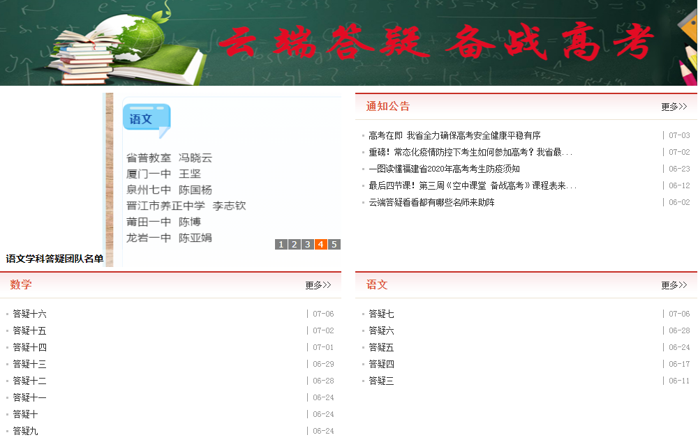 为了帮助全省高三考生及全体社会考生答疑解惑,5月28日,省教育厅网站专门开设《云端答疑备战高考》专栏,通过电子邮箱收集全省考生有关高考9门学科的问题以及备考心理困惑。6月1日,《云端答疑备战高考》专栏正式上线,邀请省级示范性建设高中高三一线名师、心理专家及省普教室教研员组建了答疑团队,解答学生的学习问题及心理困惑,并选取来邮中具有共性和代表性的问题在专栏上推送,为高三考生、社会考生及教师提供复习备考借鉴。