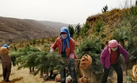 甘肃凤翔镇张家湾村的山头上,李家岔村村民李锋和几位工友正在清理生态林中的杂草、垃圾。57岁的李锋和弟弟李宏一家生活在一起,他们曾是村里的建档立卡贫困户。2017年5月,李锋成为福定生态林的一名护林员,每月有了600元的固定收入。2018年,他家的40亩山地被列入“生态林”二期用地,实施了退耕还林工程,获得补助2万元。耕地变林地,一家人也从土地上解放出来,外出务工挣钱。当年,李锋全家实现脱贫。