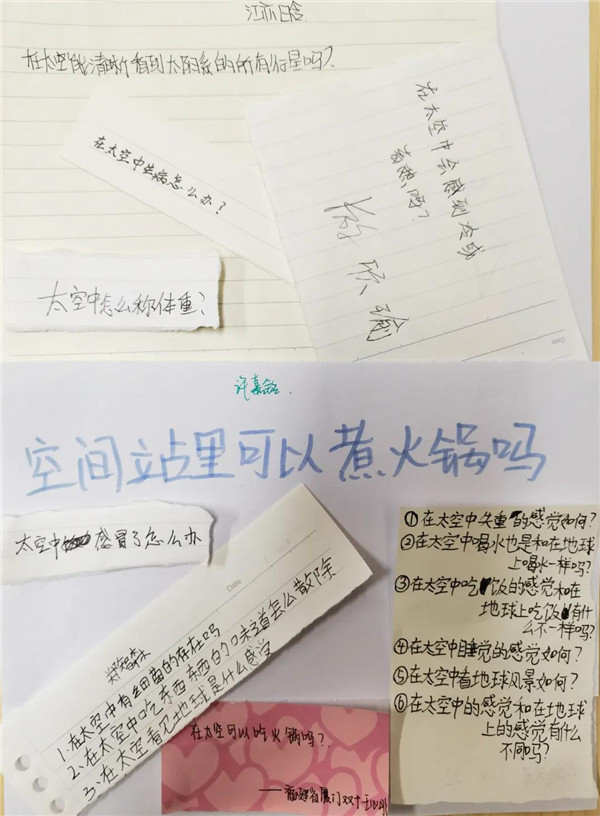 这特别的一课,让学生见过了辽阔星河,遇到了无穷奥秘。厦门双十中学学生寄了一封书信,目的地是宇宙。“在太空中,食物如何烹饪”“宇航服有多重”“夜空中最亮的星是哪一颗”“航天员们睡得好吗”这些来自学生们的问题,闪耀着求知的光辉和人生哲思,也充满着对航天员们的关切。