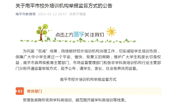 南平市教育局发布寒假期间校外培训机构举报监督方式,集中公布全市各县区教育、市场监管、科技、人社、文旅、体育等六部门的举报电话、信箱。福州市永泰县教育局、三明市大田县教育局分别向家长和校外培训机构举办者发布寒假温馨提醒。宁德市蕉城区教育局、福安市教育局在致家长一封信中附上校外培训机构“白名单”。厦门市思明区、翔安区、同安区教育局发布致家长一封信并附上教育、文旅、人社、工信部门以及负责整治托管机构等其他类型违规培训主体的各街道举报电话。漳州、三明、莆田、宁德、平潭等地市教育局和厦门市海沧区、龙岩市长汀县、福州市仓山区等县区级教育局等也纷纷发布校外培训寒假提示或致家长的一封信,并公布了举报电话、邮箱。