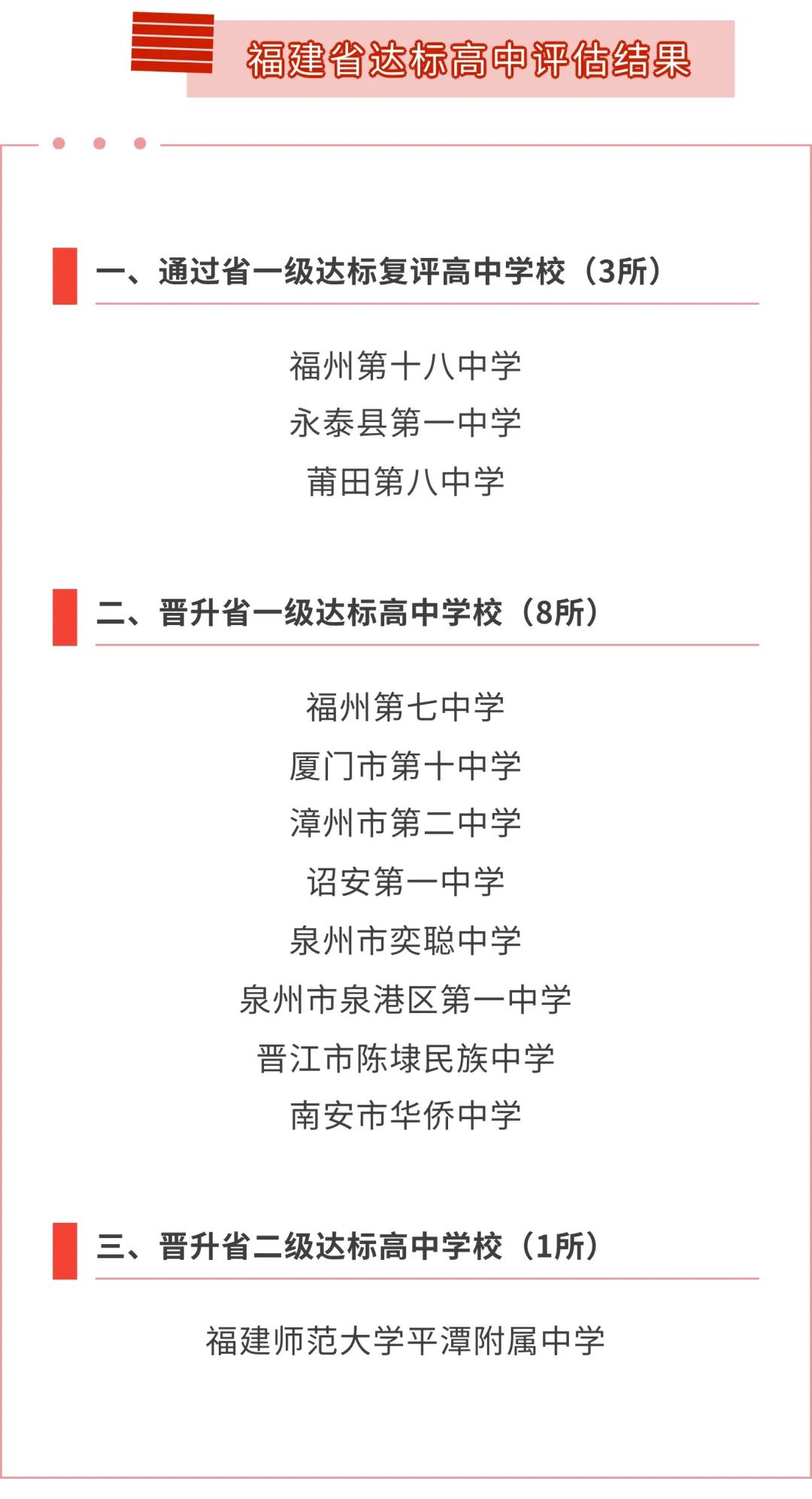 根据《福建省达标高中评估办法(修订)》,省教育厅组织开展了省级达标高中复评及申报晋级评估工作。日前,省教育厅公布省级达标高中评估结果。