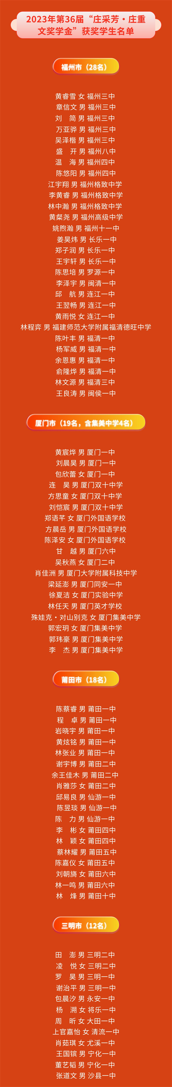 “庄采芳・庄重文奖学金”原名“庄采芳奖学金”,是香港著名闽籍爱国人士庄重文博士于1988年以其父庄采芳的名义在我省设立的。庄重文博士逝世后,其子女庄绍绥先生、庄秀霞女士等继承父亲遗愿,把“庄采芳奖学金”一直延续下来。为了纪念庄重文先生,从第21届开始“庄采芳奖学金”更名为“庄采芳・庄重文奖学金”。