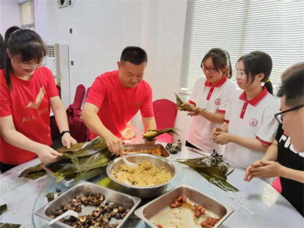 福州格致中学在学校食堂举行“粽叶飘香,浓情端午”主题劳动实践活动,食堂工作人员为同学们详细演示了包粽子的过程。在食堂工作人员的引导下,同学们从生疏到初步掌握方法,并互相交流技巧。在温馨快乐的氛围中,同学们对传统节日文化内涵的认识也加深了。