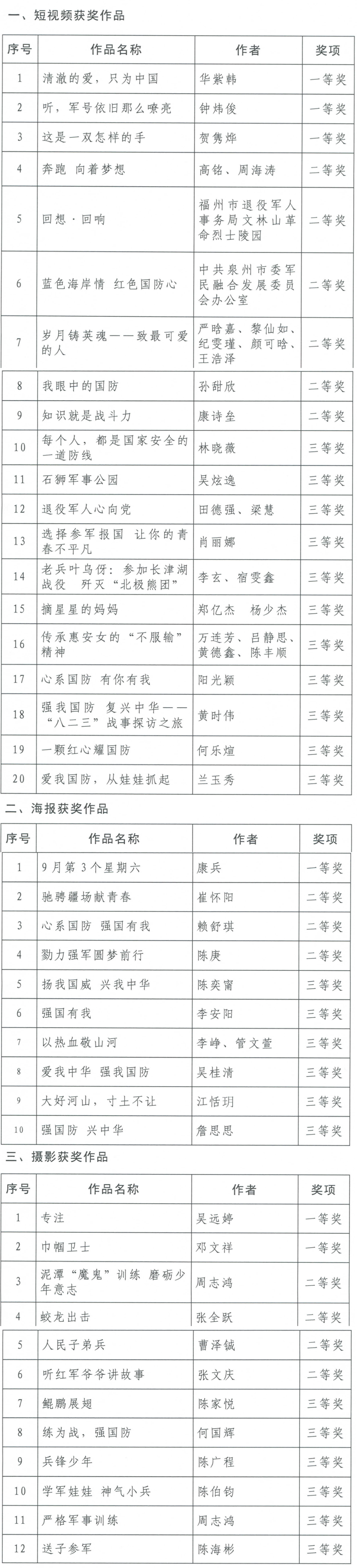 福建省“爱我国防”主题短视频、海报、摄影作品征集展示活动获奖作品名单