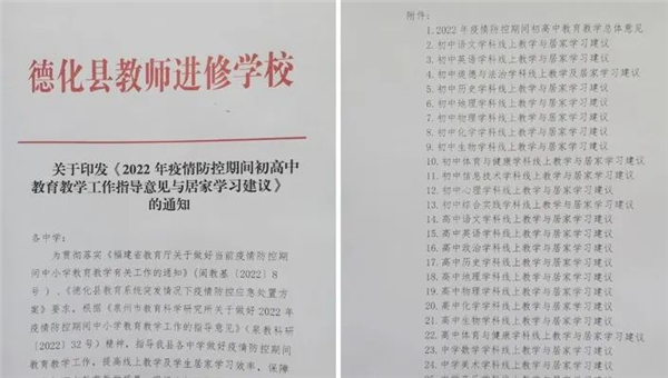 3月15日起,德化县中小学全部转为线上教学。为强化线上教育教学管理,德化县教师进修学校发布《2022年春疫情防控期间中小学各学科线上教学与居家学习建议》,及时推送优质学习资源,指导、服务中小学线上教学与居家学习,同时通过“定时+不定时在线教研”的模式,聚焦教学研究,团队合作,共享智慧,为在线教学保驾护航。