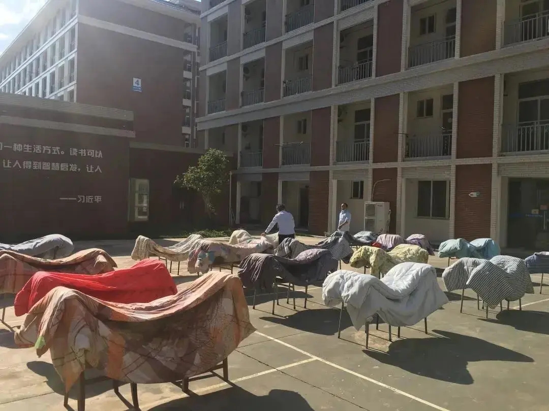 为了迎接学生返校,近日,福建水利电力职业技术学院启动了“晒被子工程”。这几日,只要是阳光明媚的日子,学生宿舍区就会出现宿管人员忙碌的身影。他们制作标签、擦栏杆、确认每件物品的位置,每一床被子都被“温暖”以待。