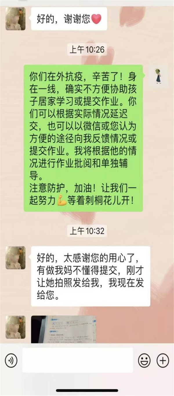 “不要着急,没赶上直播课,我会利用其他时间给你一对一上课,把落下的内容补起来。”泉州师范学院附属小学三年级1班尤老师的暖心微信回复,让在一线忙于抗疫的家长放心工作。