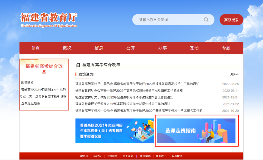 学校师生和社会各界可登陆福建省教育厅网站(网址:http://jyt.fujian.gov.cn/)《专题栏目》中“福建省高考综合改革”专栏,打开《福建省高考综合改革—选课走班指南》查询程序进行查询。在查询过程中,可以按准备报考的院校、专业进行查询,了解所选心仪院校、专业的选考科目要求;也可按照本人拟定的选考科目进行查询,了解相应选考科目组可以报考的院校和专业。