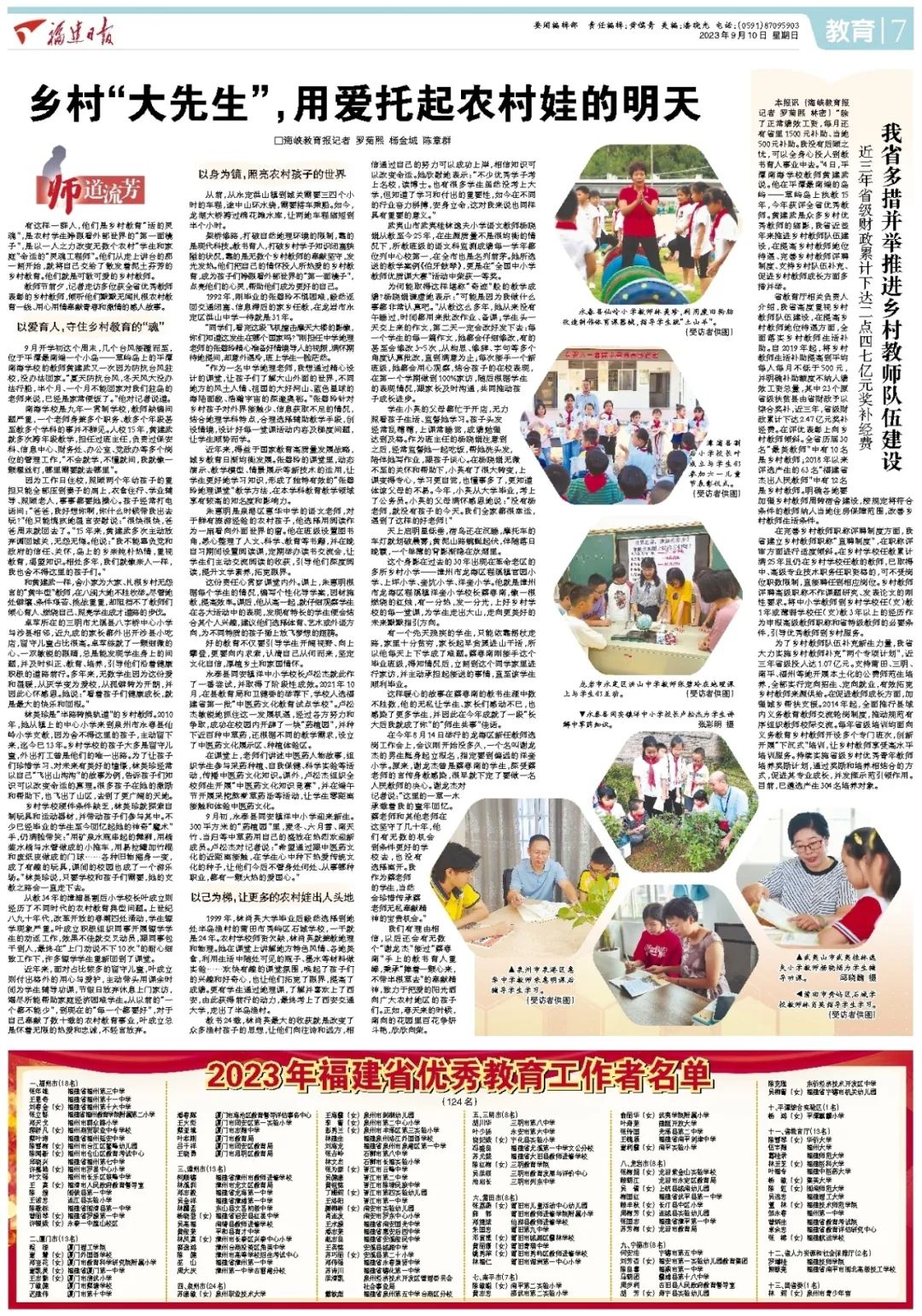 省教育厅相关负责人介绍,我省高度重视乡村教师队伍建设,在提高乡村教师地位待遇方面,全面落实乡村教师生活补助。自2019年起,将乡村教师生活补助提高到平均每人每月不低于500元,并明确补助额度不纳入绩效工资总量,其中23个原省级扶贫县由省财政予以综合奖补,近三年,省级财政累计下达2.47亿元奖补经费。在评优表彰上向乡村教师倾斜。全省历届30名“最美教师”中有10名是乡村教师;2018年以来评选产生的63名“福建省杰出人民教师”中有12名是乡村教师。明确各地要加强乡村教师周转宿舍建设,按规定将符合条件的教师纳入当地住房保障范围,改善乡村教师生活条件。