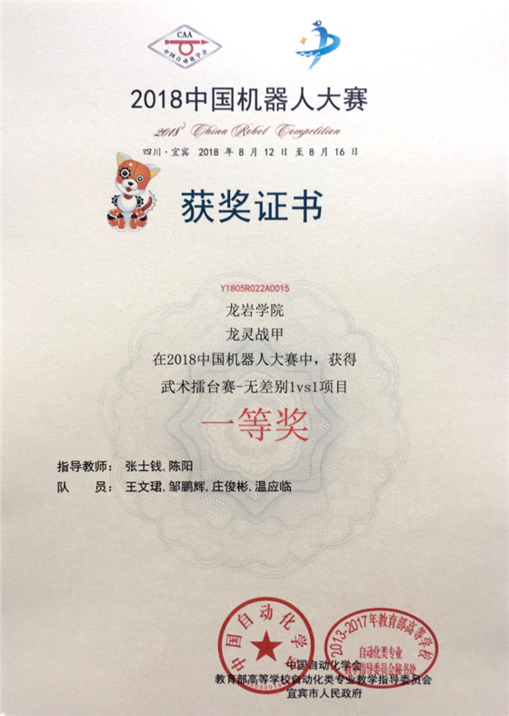 近日,2018中国机器人大赛在四川省宜宾市临港开发区会展中心落幕。龙岩学院机电工程学院学生王文珺、邹鹏辉、庄俊彬、温应临组成的 “龙灵战甲”团队获得武术擂台赛——无差别lvsl项目一等奖。此外,由张坤鹏、温应临、邹鹏辉、林佳子组成的“威龙骑士”团队获得武术擂台赛——轻量组项目三等奖。