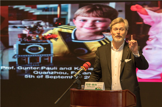 9月5日下午,由环境保护部宣传教育中心开展的2018年中国青少年生态教育示范课进校园活动在泉州理工学院举行。联合国零排放创新基金会发起人、生态活动家、《冈特生态童书》作者冈特·鲍利先生,联合国零排放创新基金会法律总监、《冈特生态童书》插画师凯瑟琳娜女士,和泉理工师生面对面分享了生态保护理念。