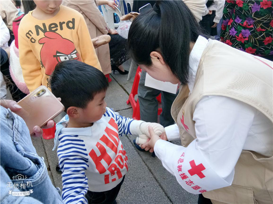 演示过程采取志愿者讲解示范,观众参与演练,家长和孩子们在指导下相互包扎等方式,营造了浓浓的“人人学急救,急救为人人”的现代安全教育氛围。