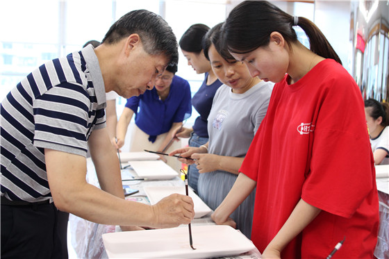 6月27日,学园邀请国家一级美术师、陶瓷书法家、中国工艺美术家协会理事、世界文化艺术研究中心非物质文化遗产传承人郑克通大师来园,对全体教师进行陶瓷书法技能培训。郑克通结合视频,从陶瓷上的书写与宣纸上书写的不同、釉上书法与釉下书法不同的陶瓷装饰、颜料的调配等几个方面,生动而细致地阐述了陶瓷艺术和书法艺术的完美结合焕发出独特的艺术魅力。此外,郑克通讲解并演示了如何将书法写在陶瓷上,加深了学习者的感悟体验。老师们全神贯注地学习,专心致志地临摹,不时向郑克通大师请教,于陶瓷、书法之间领略两大国粹结合的艺术美。