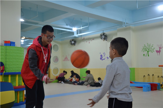 来到游戏室,自闭症儿童们在家长及志愿者的陪同下开始练习拍篮球,互相传球,投掷小球等游戏。捡球,丢球,接球……这些看似简单的动作,却因为这些孩子大都难集中注意力而进行的异常艰辛,比如偶尔他们会把球丢在一边不管或突然嚎啕大哭。而家长和志愿者们却总是十分耐心地陪他们重复训练,帮助这些孩子锻炼四肢及身体的协调能力,以及与人交流的能力。