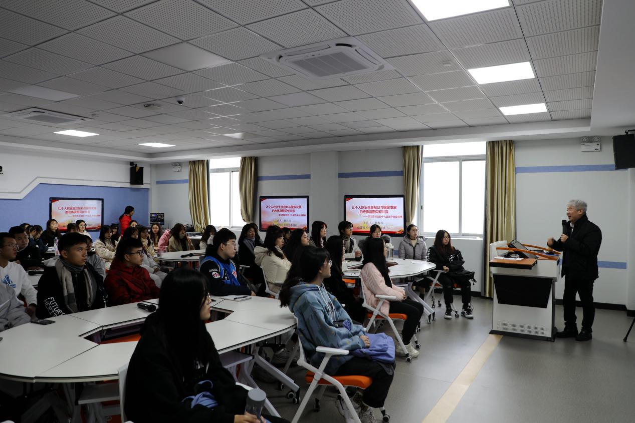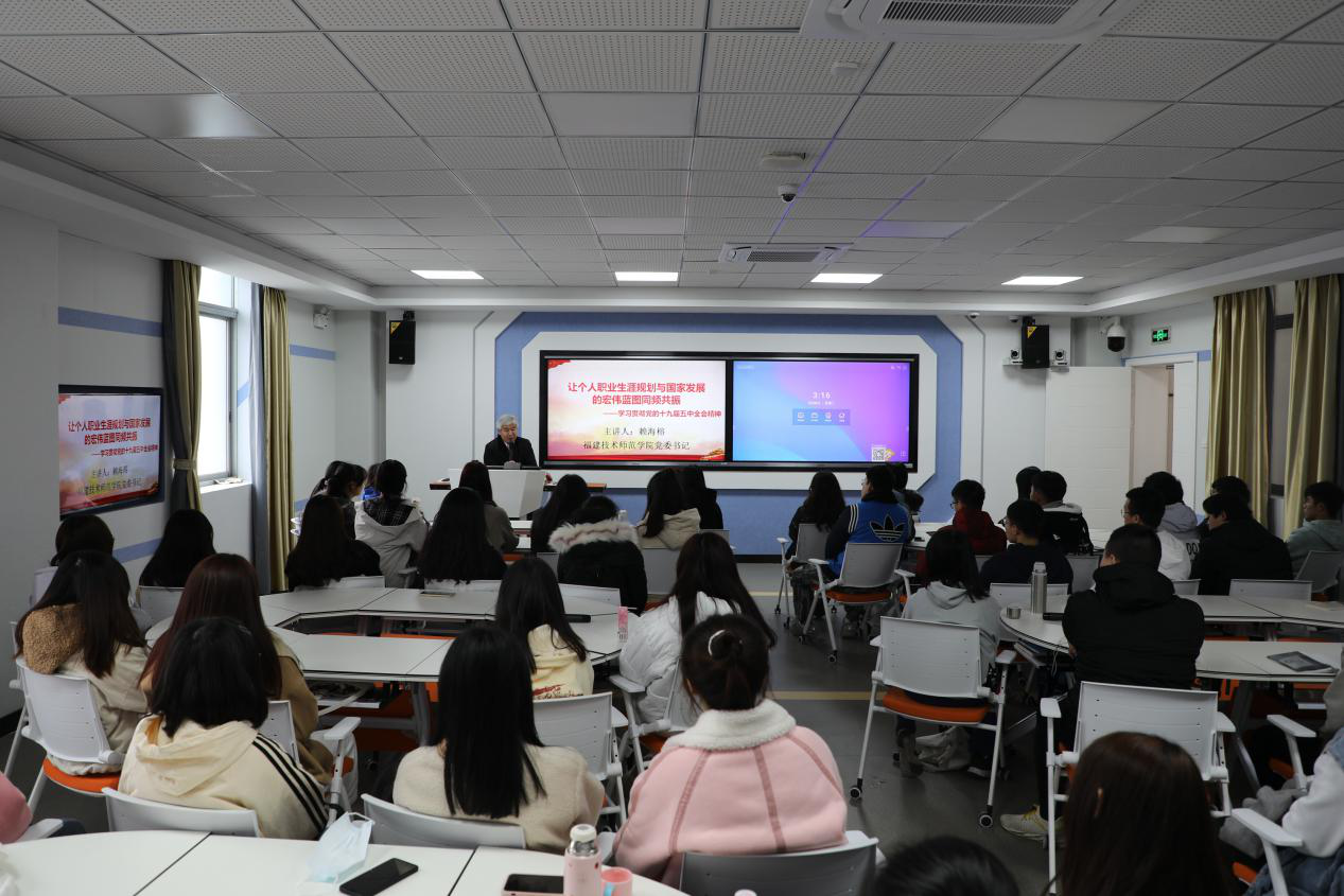 12月16日下午,福建技术师范学院党委书记赖海榕教授以《让个人职业生涯规划与国家发展的宏伟蓝图同频共振——学习贯彻党的十九届五中全会精神》为题,为该校经济与管理学院国际经济与贸易专业2019级同学讲授了一堂形势与政策课。