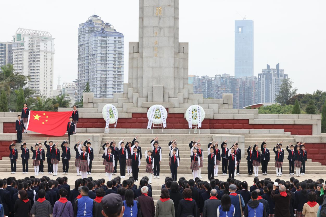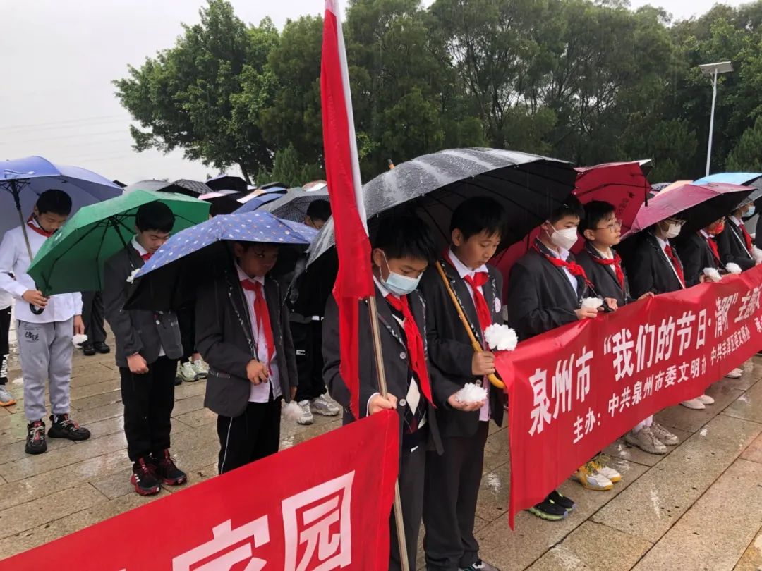 泉州市丰泽区第五中学小学在校师生冒着风雨,徒步来到泉州市革命烈士陵园祭扫英烈。师生排着整齐的队伍,一起瞻仰泉州市革命烈士纪念碑,共同缅怀先辈的光辉事迹。肃立、默哀、鞠躬、致敬……