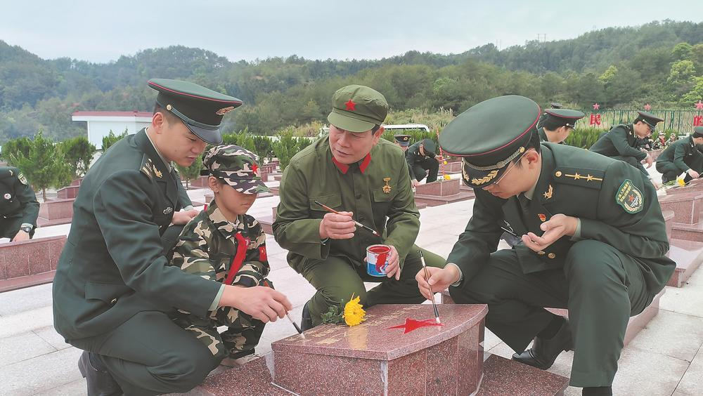 在龙岩市永定区,老战士熊兆祥与部队官兵、少年军校学生共同为烈士墓碑描红