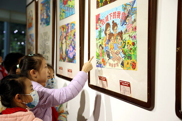 参展作品形式多样,孩子们用手中的画笔表达了他们对“双减”、对课后服务的理解。
