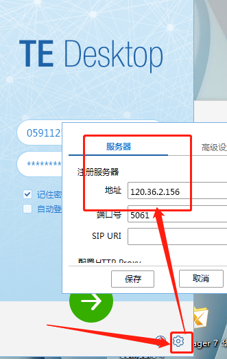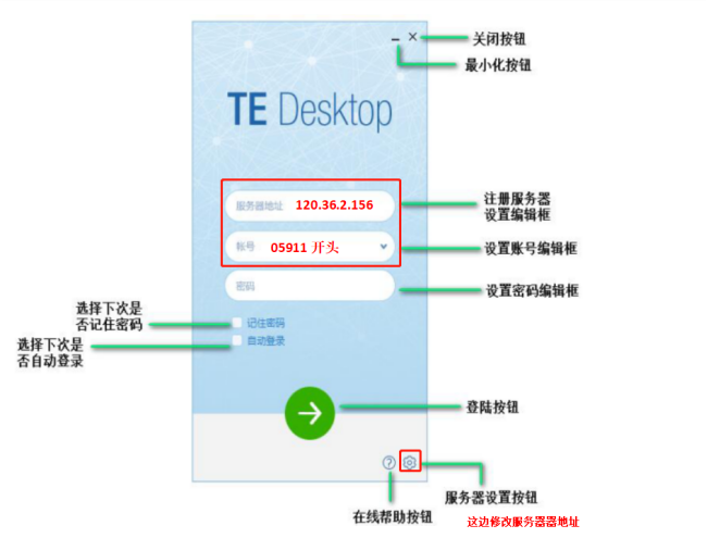 (1)安装好TE Desktop,填写注册服务器地址“120.36.2.156”,输入用户账号密码登录平台。