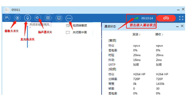 (2)可以进入通话状态,查看音视频接收发送情况,排查接入网络带宽等信息。