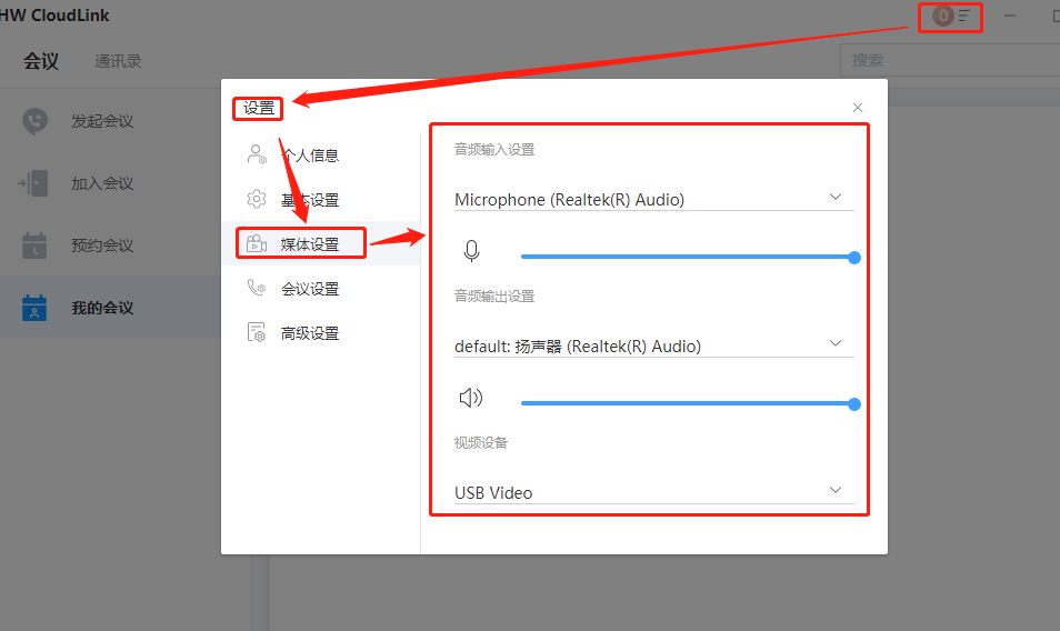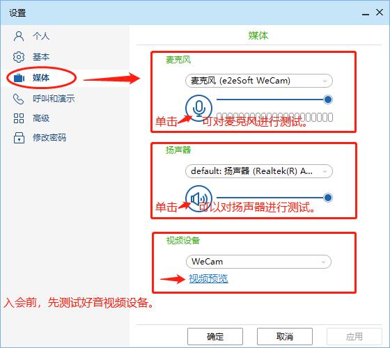 点击主界面右上角图标进入“设置”界面,“媒体设置”按钮,进行麦克风、扬声器和视频设备设置,特别是与会后没有声音的,请提前做个测试。