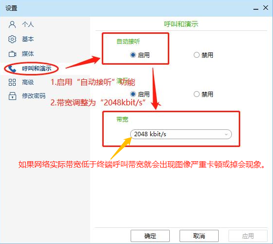 进入“呼叫和演示”配置界面,选择“自动接听启用”,带宽选择“2048kbit/s,点击应用。