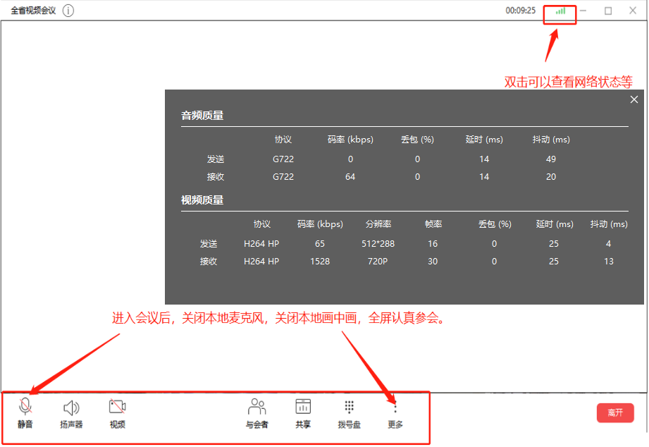 进入会议后,关闭本地麦克风,关闭本地画中画,全屏认真参会。