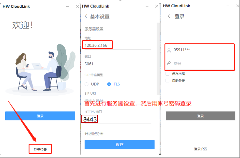 (1)安装好HW CloudLink,填写注册服务器地址“120.36.2.156”,HTTPS端口“8443”,输入用户账号密码登录平台。