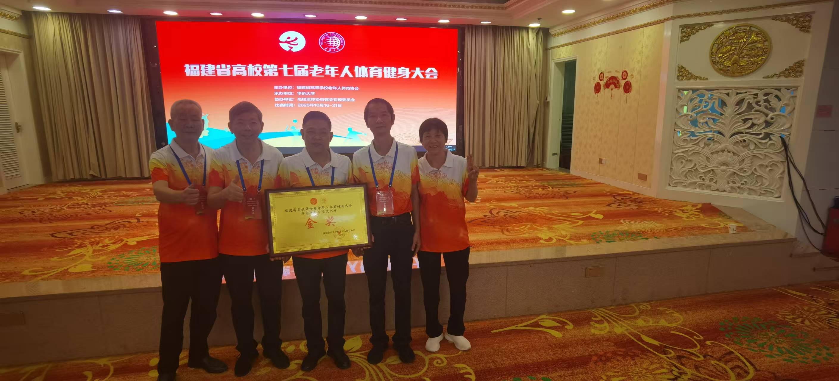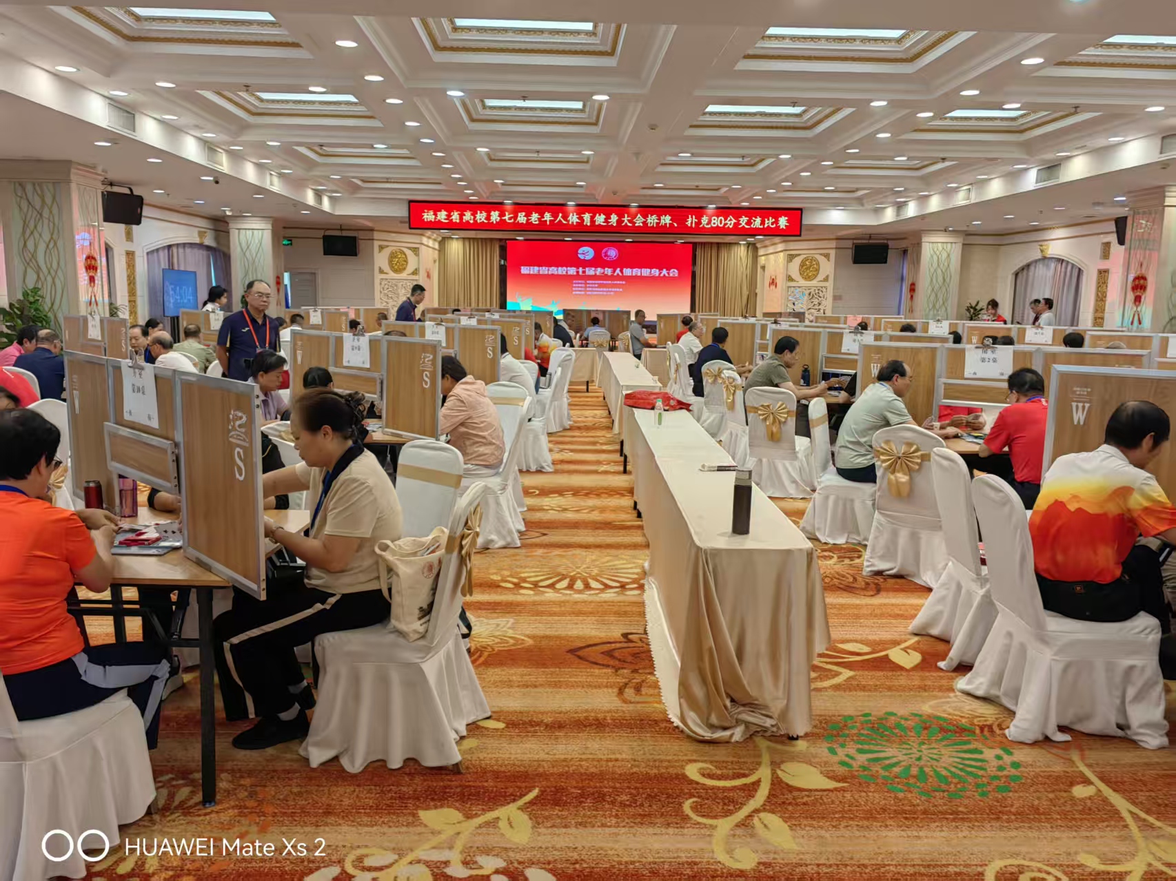 福建省高校第七届老年人体育健身大会扑克牌80分交流比赛,2025年10月16-18日,在泉州湖美大酒店举行。本次项目设置为团体赛,采用计副制瑞士移位赛(积分编排),共6轮,每轮6副牌,每轮比赛的时间约70分钟。共有19所高校和1个混合队共20支队伍参加,参赛选手们沉着冷静,默契配合,斗智斗勇、捕获战机,秉持着“以牌会友、切磋技艺”的理念,在牌局中展开智慧的较量和勇气的竞争。