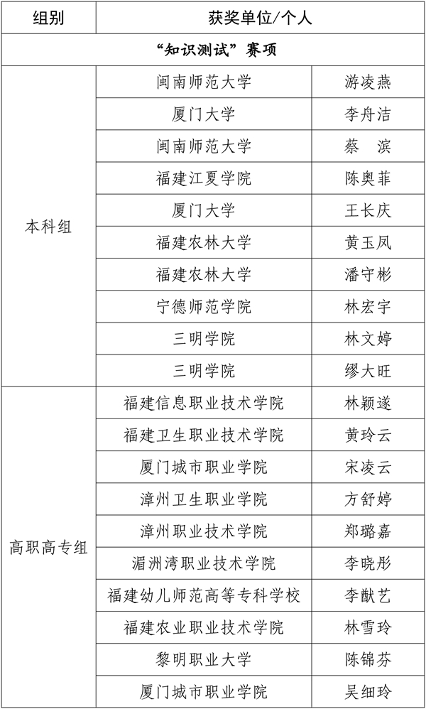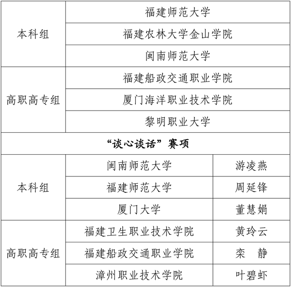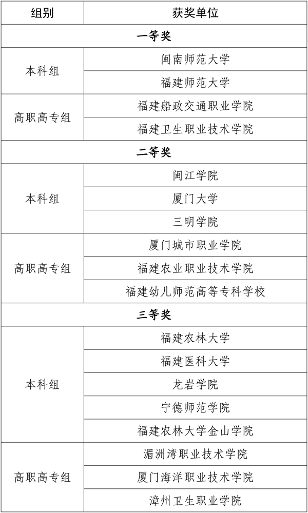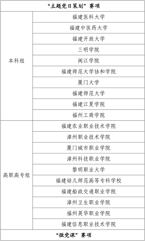 本次大赛设本科组和高职高专组,分为3个阶段进行,涵盖“知识测试”“主题党日策划”“微党课”“谈心谈话”等4个赛项,共有86个高校的258名教师、学生党支部书记和二级院系党组织负责人、专职组织员等基层党务干部参赛。经过激烈角逐,闽南师范大学、福建师范大学获本科组团体一等奖,福建船政交通职业学院、福建卫生职业技术学院获高职高专组团体一等奖;闽江学院等3所学校获本科组团体二等奖,厦门城市职业学院等3所学校获高职高专组团体二等奖;福建农林大学等5所学校获本科组团体三等奖,湄洲湾职业技术学院等5所学校获高职高专组团体三等奖。