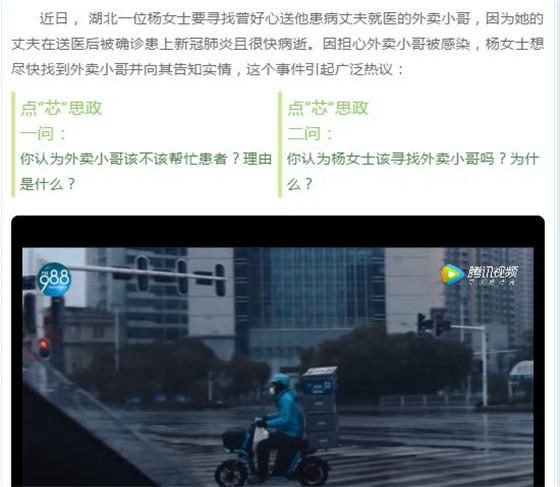 南平市高级中学吴红红老师的宣讲课《隔离病毒,但不隔离爱》,从青年学子的回答导入,引导同学们充分挖掘身边的所见所感作为素材,将生活融入政治课堂,也让政治课堂走进生活。吴老师还巧妙引用“湖北杨女士紧急寻找帮其送患病丈夫就医的外卖小哥”这一话题,设问引导学生发散思维,从快递小哥引申到全民动员乃至团结互助的民族精神,小切口见大视野,践行了政治学科的育人价值。