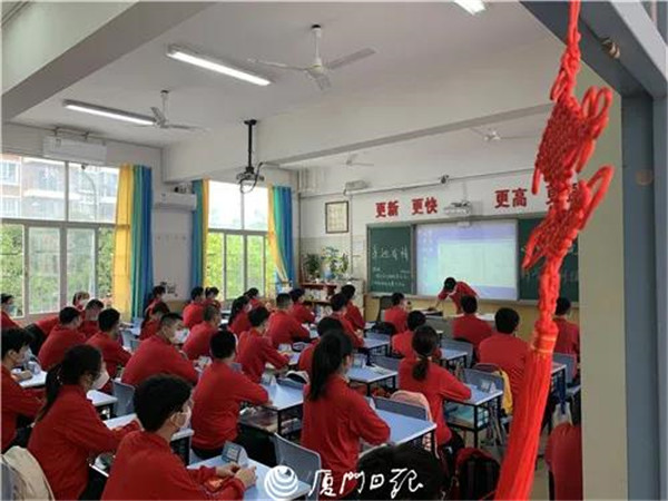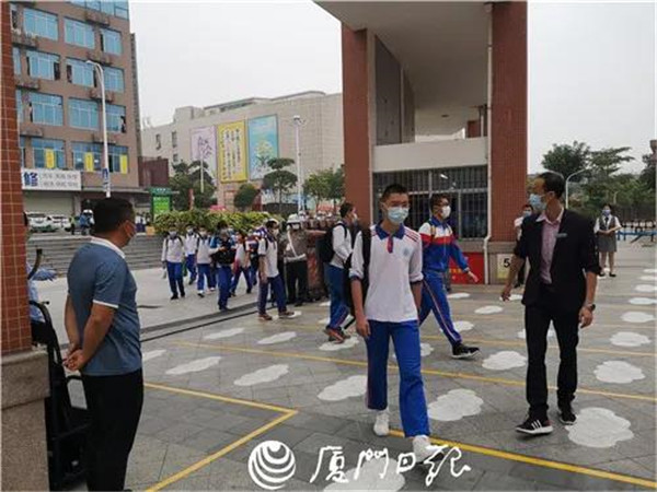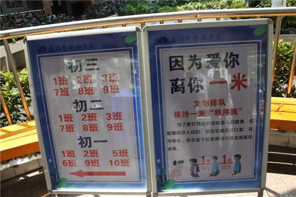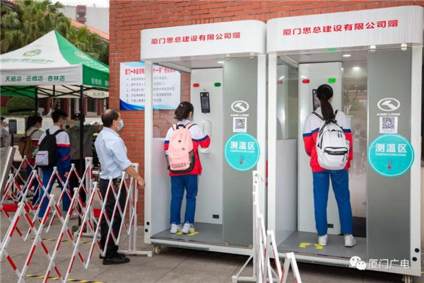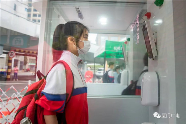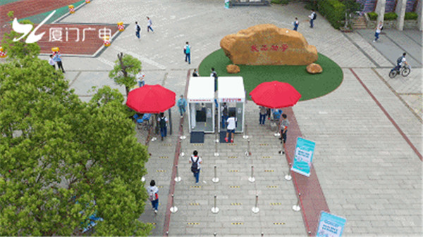 今天上午,厦门一中初三年级的16个班近800名学生分批进入校园。同学们进校前都需经过智能防疫工作站或红外线体温测量仪。