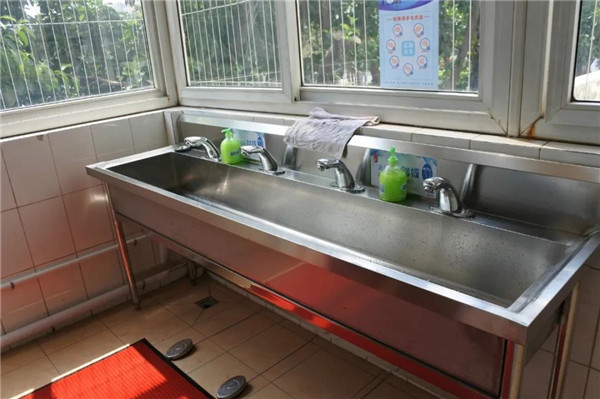 此外,学校还添置了32个脚踏开启的水龙头,在卫生间门口增加洗手台、配齐洗手液等,规划了洗手线路,切实把好防疫关。