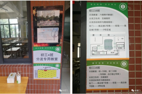 厦门六中的教室里还配备有消毒液和纸巾供学生们使用,教室门口贴着关于学生分流的详细区域图。